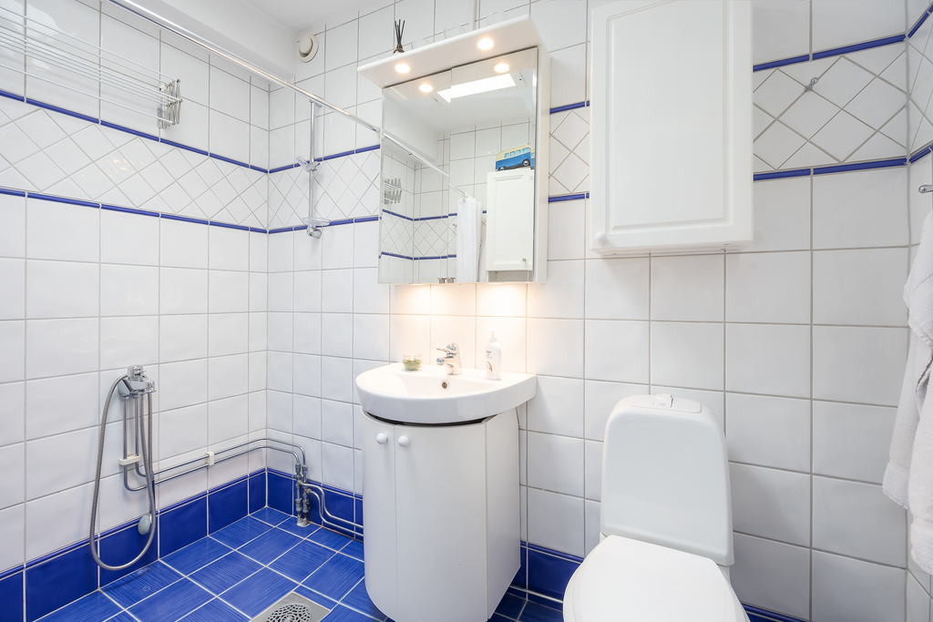Helkaklat badrum i bra storlek med vita väggar och klarblått klinkergolv. Duschhörna - wc, handfat med kommod och badrumsskåp med spegel. Ett takfönster släpper in dagsljuset.