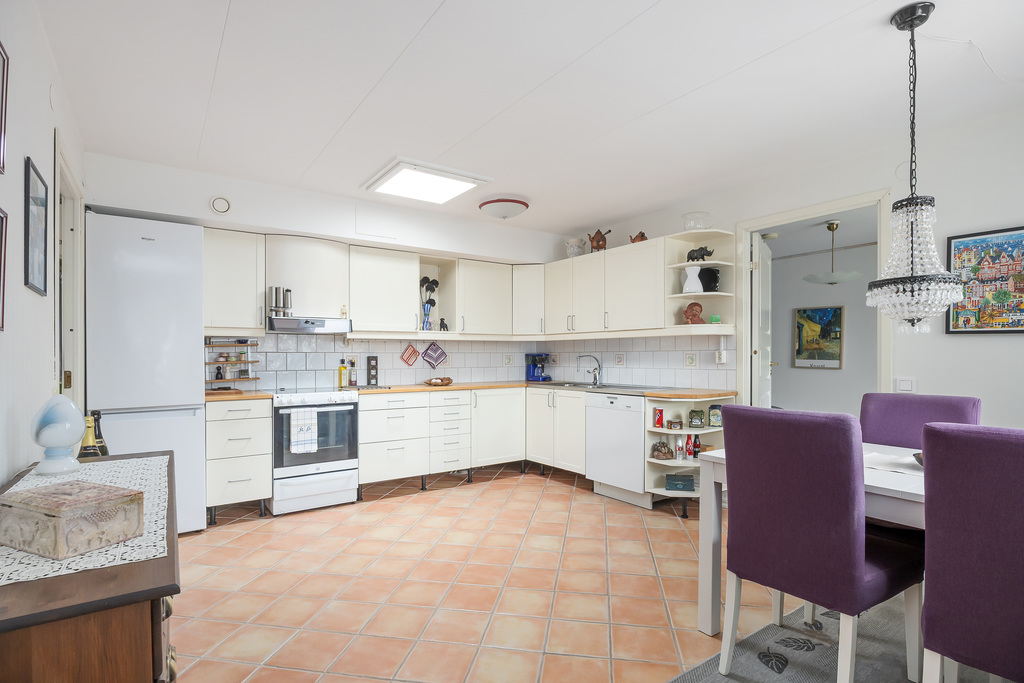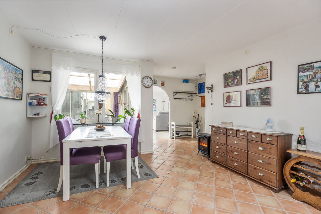 Matplatsen är lagom för ca 4-6 personer och köksfönstret har utsikt mot uteplatsen.