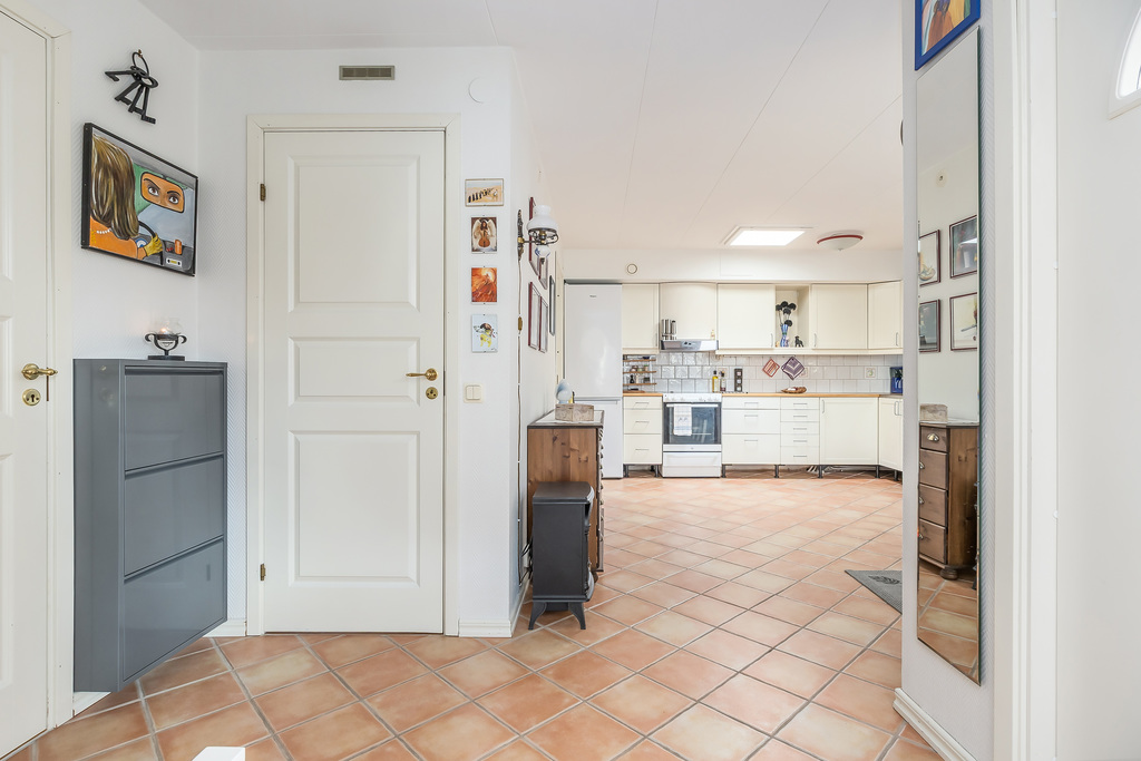Stig in i bostaden genom en ytterdörr med fönster - rakt fram finns plats för avhängning ytterkläderna samt en riktigt stor garderob som rymmer det mesta!. Terrakottafärgad golvklinker och vitmålade väggar.