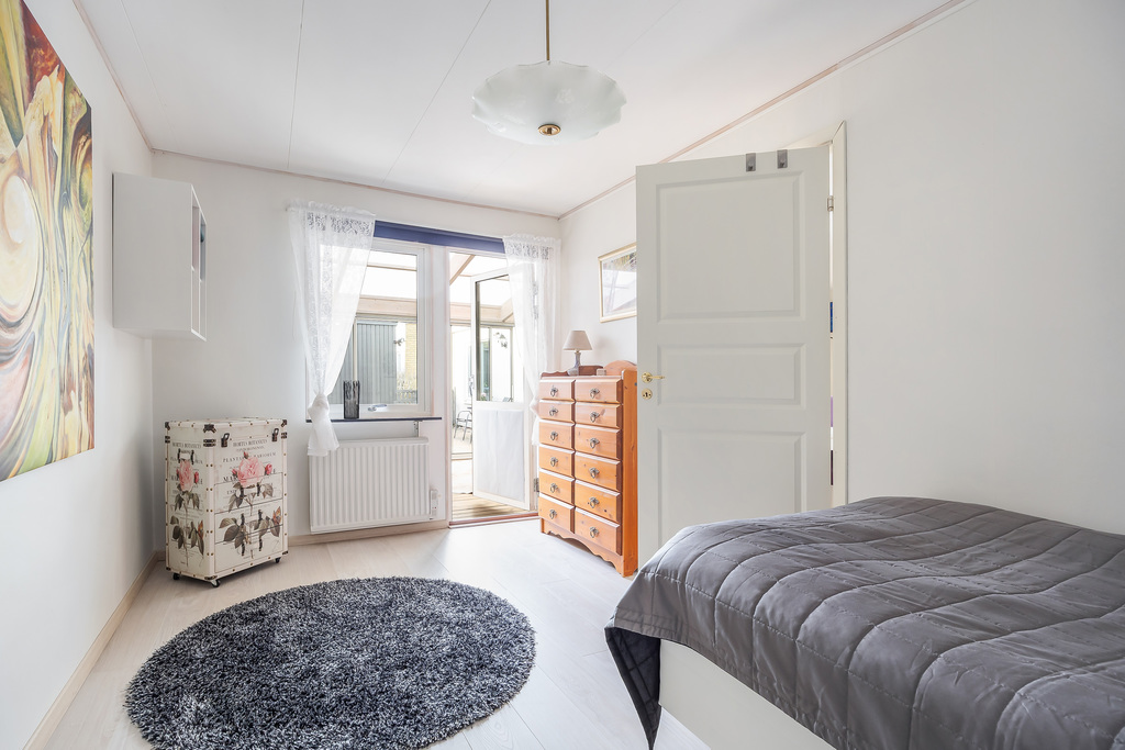 Sovrum 2: Det andra sovrummet ligger innanför köket och har egen dörr ut till uteplatsen. Ljust golv och målade väggar i ljus nyans.