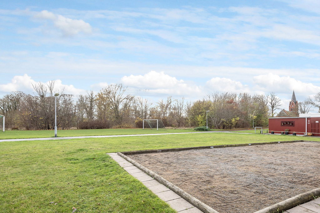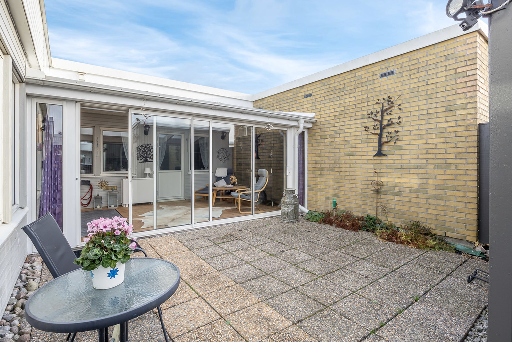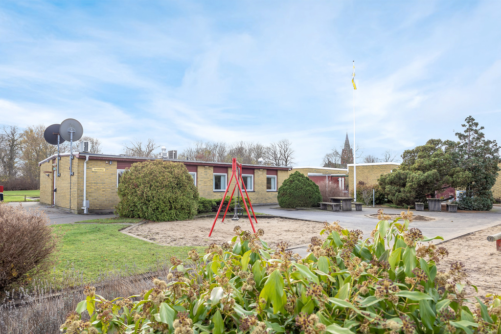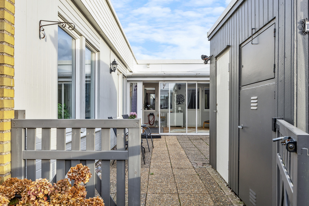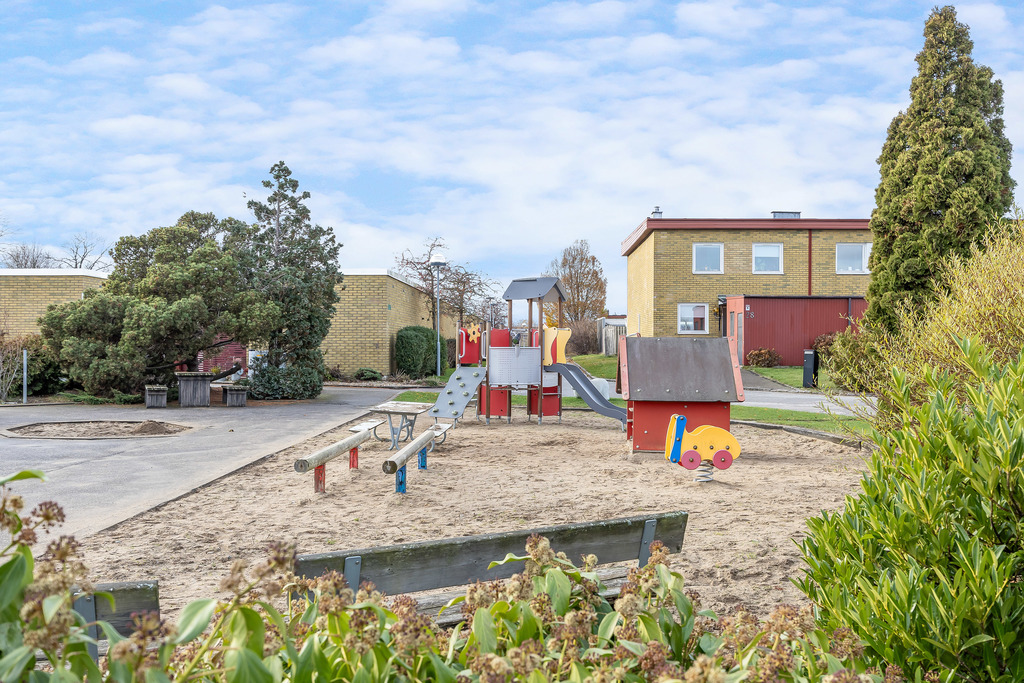 Huset har en lättskött och skyddad atriumgård i bästa soliga västerläge - här har man sol i stort sett hela dagen! Huset är uppbyggt runt denna och alla fönster i vetter ut hit, vilket skapar ett mycket privat boende utan insyn från grannar eller förbipasserande och dessutom ett extra skydd från de skånska vindarna. Här tillbringar man gärna sommardagar med lata dagar i solen och mysiga grillkvällar - och för den som önskar grönska finns gott om plats för krukor och odlingsbäddar. Ett praktiskt förråd på ca 6 kvm rymmer allt som behövs.